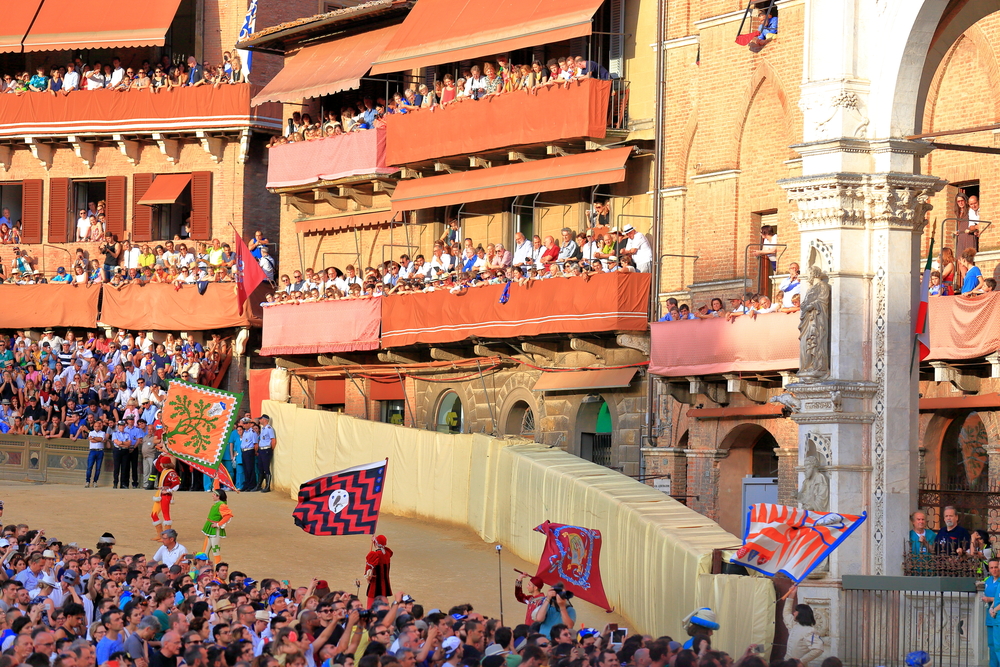 Il Palio is a horse race held twice annually on July 2 and August 16. Tradition has it that 10 horses and riders, bareback and dressed in the appropriate colours, represent 10 of the 17 city wards. The Palio held in July is called Palio di Provenzano while the event held in August is the Palio dell'Assunta. Siena is the destination on the Macs Adventure walking holiday from Florence to Siena.