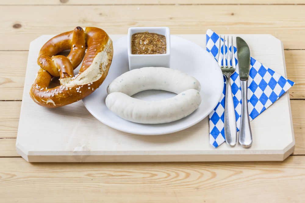A Bavarian Weisswurst translates as white sausage. It is made from minced veal and pork back bacon and is usually flavoured with parsley, lemon, mace, onions, ginger and cardamom, although there are some variations. Weisswürste are traditionally made in the early morning and eaten as a snack between breakfast and lunch. In fact, there is a saying that the sausages should not be allowed to hear the noon chime of the church bells. This is because they are made without preservatives and need to be eaten fresh. Traditional Weisswurst is served with sweet mustard and a soft pretzel. Sample Weisswurst on a walking holiday in Bavaria.